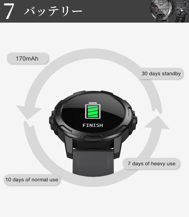 待機状態約30日間、通常使用約5〜7日間の使用が可能。