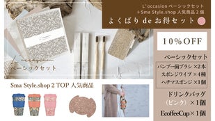 ・完成したL’occasionの商品セット(バンブー歯ブラシ2本、スポンジワイプ4種、ヘチマスポンジ1個)とSmaStyle.shop人気商品(ピンクのドリンクバッグEcofe1個、EcoffeeCup1個)のセット