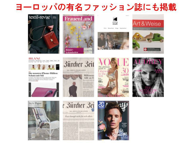 ヨーロッパではVOGUE、AUDREY、Frauen Land、textil-revue、BILANZ、Style Paper、Art & Weise、NZZ、20minutenなどの有名なファッション誌や新聞・ニュース等でもご紹介されております。