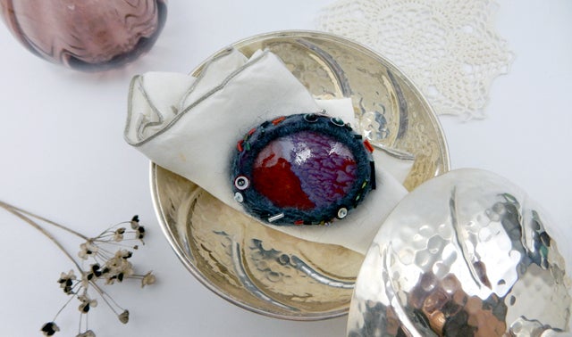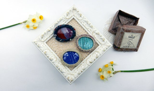 材料:磁器、コード、毛糸、刺繍糸、スパンコール、ビーズ、金具