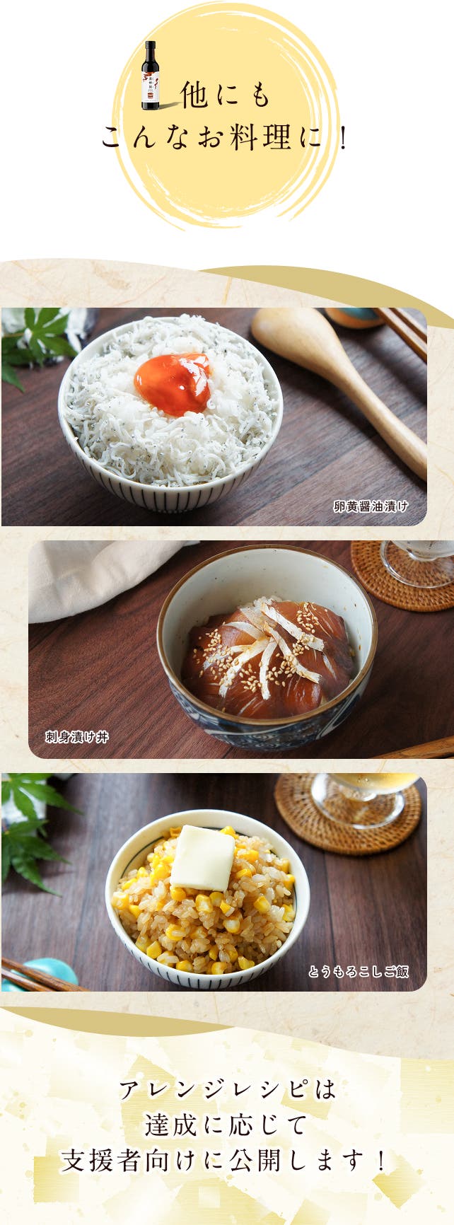 個性のある角長様の濃口醤油に、私たちのアイデアを掛け合わせることで、日々の料理に新たな個性をプラスできる。
