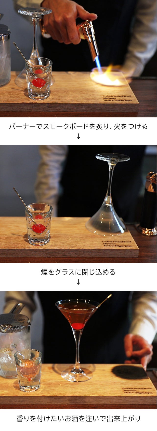 外でお酒を楽しみたいけれど、家で自粛をしてくださってくれている方々にも、自宅で少しでもバー気分を味わっていただきたい。スモークボードで、一風変わったお酒の楽しみ方をご提案いたします。