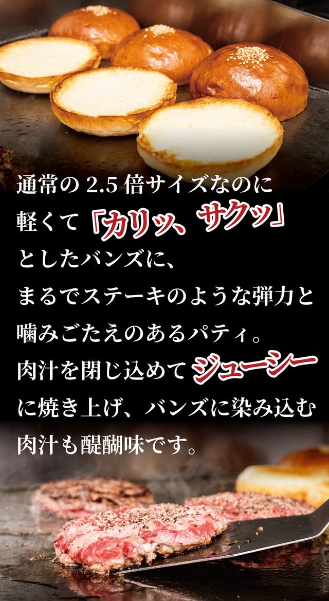 通常の2.5倍の大きさから溢れ出る肉肉しいパティと肉汁をご自宅でもお楽しみください。