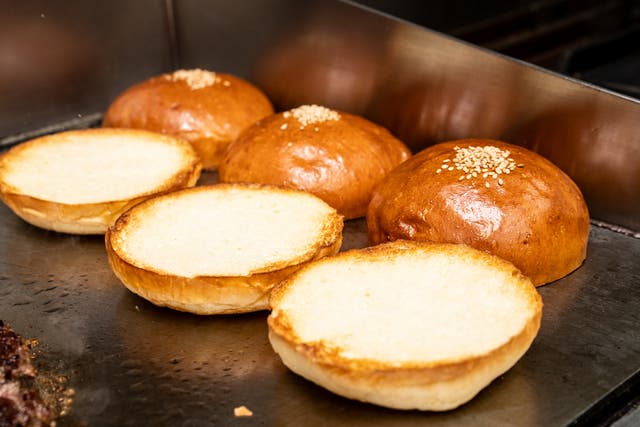 仕上げに、鉄板でこんがり焼いた特製バンズでパティを挟んで完成です。
