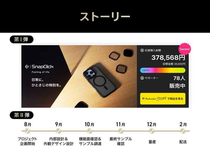 「Makuake(マクアケ)」は、実行者の想いを応援購入によって実現するアタラシイものやサービスのプラットフォームです。このページは、 プロダクトカテゴリの 「【SnapClick II】スマホを守り、撮影を広げる「レンズ付き一体型ケース」」プロジェクト詳細ページです。