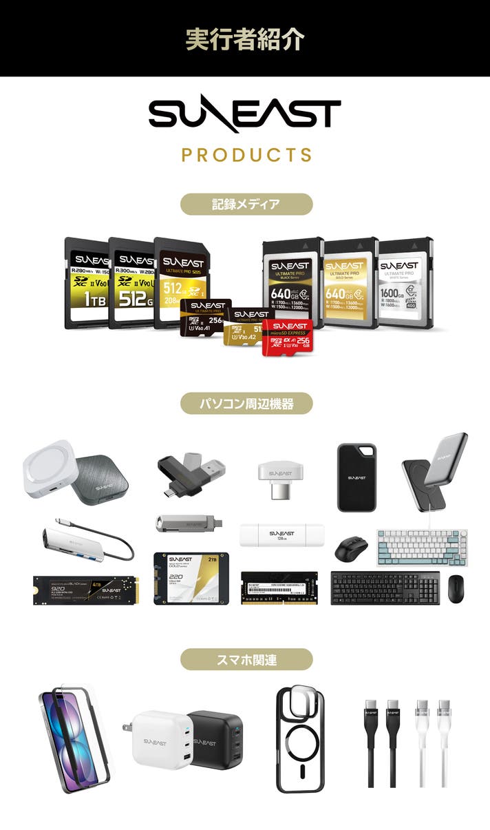 SUNEASTは、メモリーカード、PCパーツ、SSD、スマホアクセサリーなどを取り扱う日本企業です、高品質で信頼性の高い製品つくりを大切にし、国内外のお客様に向けて確かな技術とサービスを提供しています。
