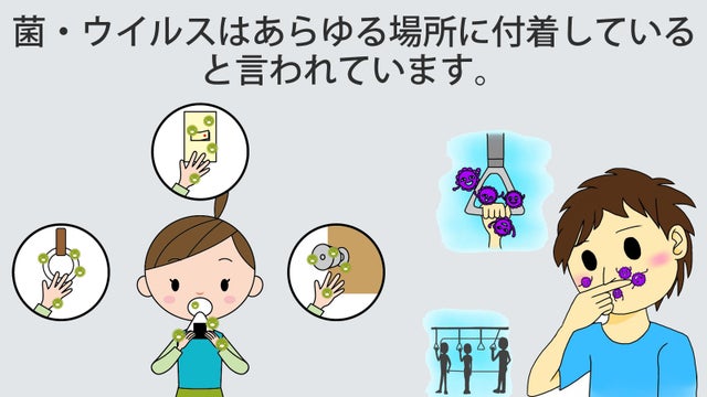 モノから手に付着した菌・ウイルスが食事や顔を触る事で鼻や口から体内に入ると言われています。