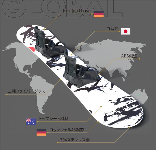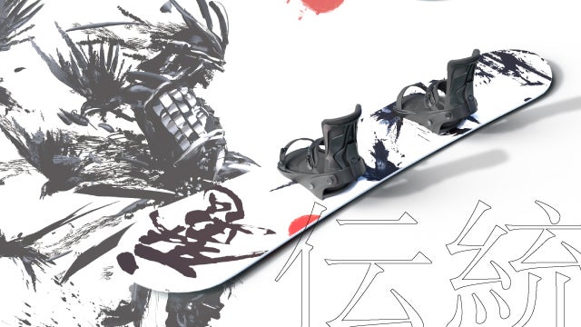 - 高いパフォーマンスを発揮する性能で、躍動感と伝統墨絵デザインを両立したスノーボードです。