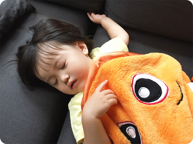 「スナギーテイル」は、包み込んで暖めてくれるから、お腹がめくれて風邪をひいてしまうなんて心配もありません。もしかしたら、スナギーテイルを持って、一人で寝ちゃう時がくるかも!?