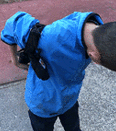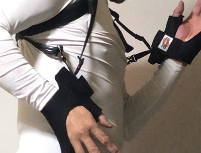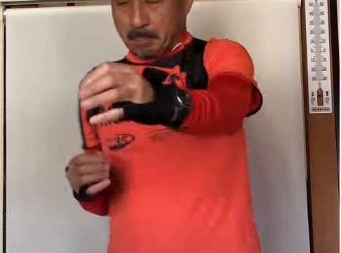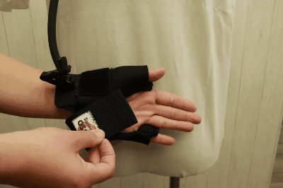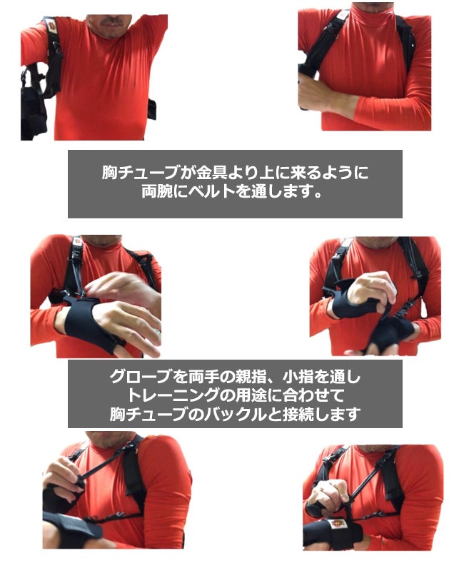 両腕をベルトに通してグローブに親指と小指を通してグローブのマジックテープで手首をしっかり固定します。