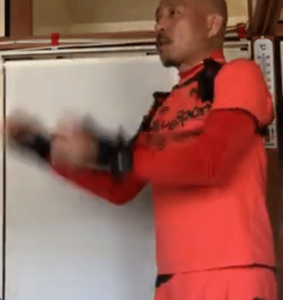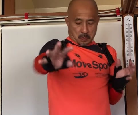 装着方法も簡単で、両腕を左右のベルトに通し器具に付いているトレーニングチューブの先端部分のグローブに親指、小指を通し手首のマジックテープで固定するだけの簡単装着です。トレーニングチューブが腕振り速度を上げ手を振るたびに負荷を掛ける事でどこでも鍛えることができます。