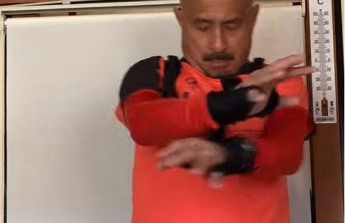 腕を左右に広げ、床と並行に左右から腕を閉じ手のひらをクロスします。