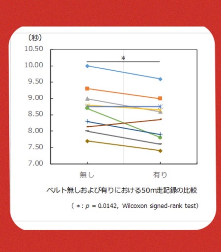 S.O-beltを装着し100m×4本後、50mダッシュで2本計測後、脱着して50mダッシュ2本を合計8日間(1日4本)計測した結果、それぞれベスト記録を更新した子供が21名もおり、短期間で効果が出ました。