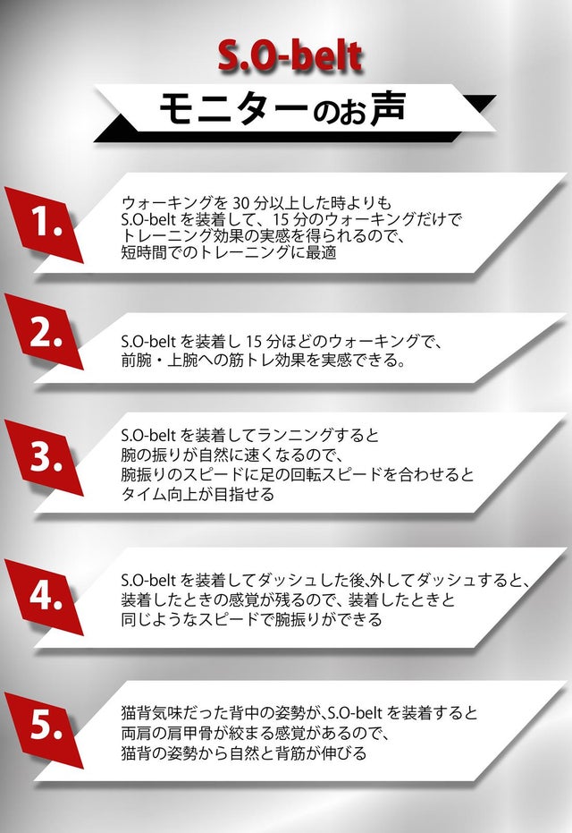 S.O-belt(エスオーベルト)を着用すると、腕振りは肩掛けベルトの金具にチューブを掛ける事で腕振り半径が小さくなり更にチューブの伸縮作用で腕振り速度が上昇、それに伴い自然に脚のスイングスピードが上がりスピードが上がります。これにより楽にスピードトレーニングが実施出来ます。