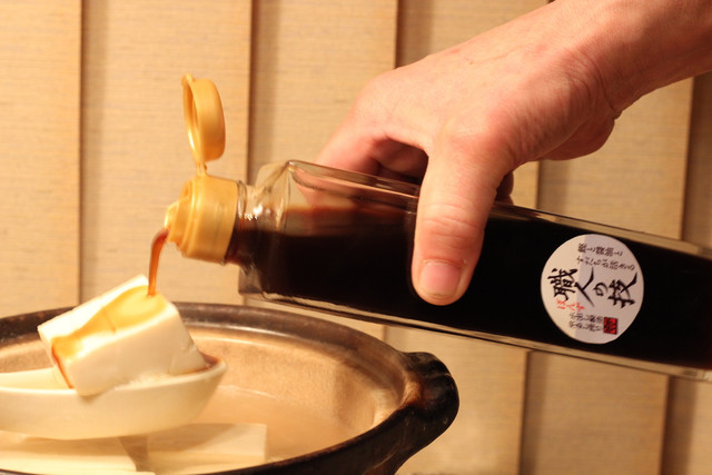 熱々の湯豆腐をレンゲに乗せて、その上に薬味、「職人の技」を垂らし口の中へ。
