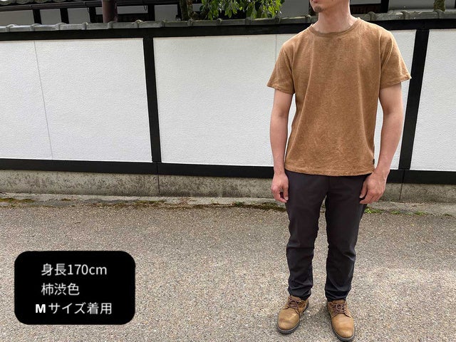 色落ちこそあれ、色が深くなるTシャツは面白く、私達が染めた柿渋の商品は使い込むほどに柿渋の力が徐々に色濃く発色していき、染め始めた時よりも変化し続けてていきます。柿渋の独特の風合いや、色のムラ感は科学の色素では出せない美しさがあり、その過程を楽しみながらお召しいただけます。