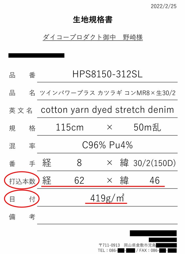 しっかりとした密度を表す「打ち込み本数」と、生地の重さを意味する「目付」もしっかりとしたデニム生地を使用!