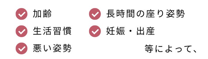 肩や首、腰の凝りと同様に、お尻の奥にある骨盤底筋も硬くなります。