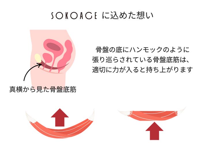 『SOKOAGE®(ソコアゲ)』は、骨盤底筋が骨盤の“底(SOKO)”を引き“上げ(AGE)”て支える構造・機能から。同時に、デリケートな悩みで落ち込んだ“心の底”も引き上げたいという願いを込めています。