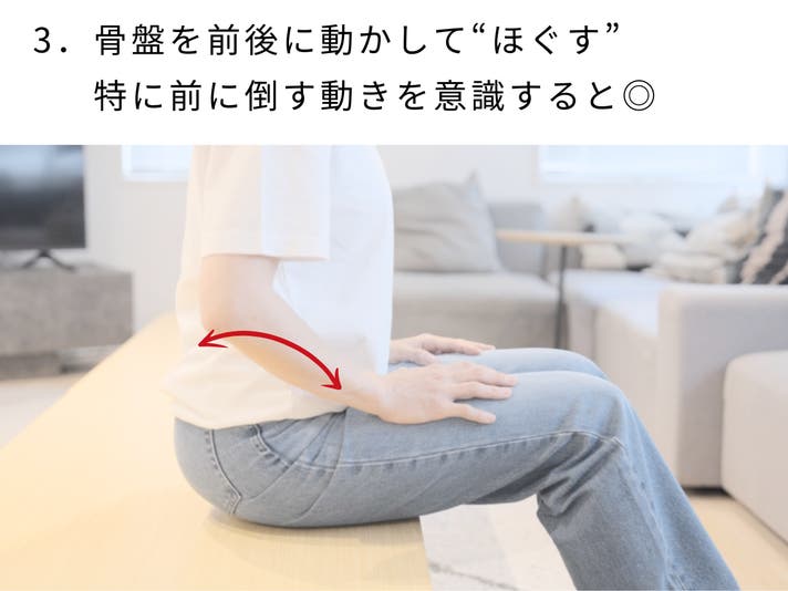 骨盤を前に倒す動き(骨盤の前傾)を入れることで、骨盤底筋周りをダイレクトに刺激します。