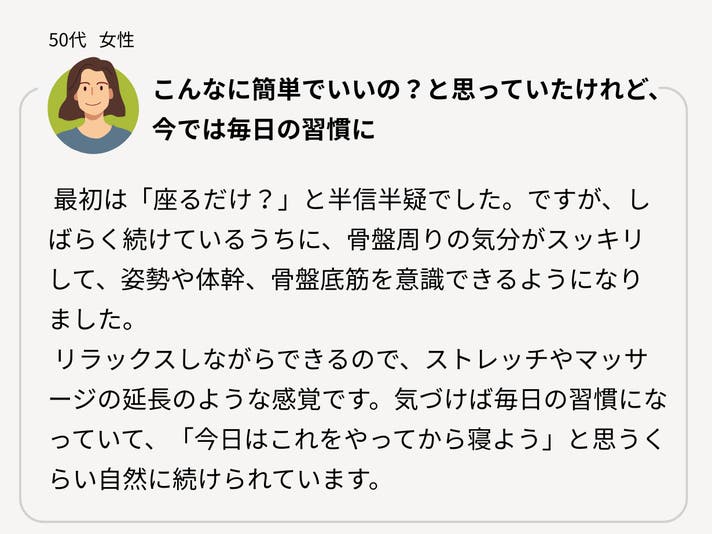 - 座るだけで骨盤まわりのこわばりを“ほぐし”、デリケートな悩みを気にせず過ごせる毎日へ。