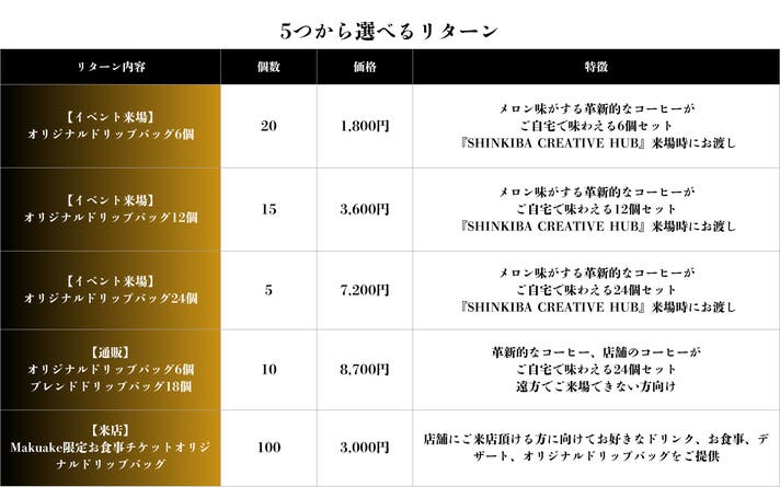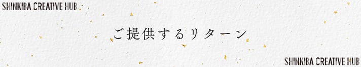 今回は5つのリターンをご用意しました。「SHINKIBA CREATIVE HUB」にご来場いただける方向け、店舗にもご来店いただける方向け、遠方で難しい方向けにご用意しており、ご自身のお住まいによってお選びいただけるリターンとなっています。