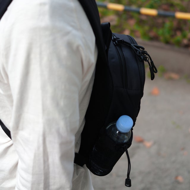 取り出しやすく、外部に装備。ペットボトルは逆さに振っても落ちにくい。