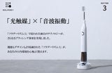 ソラデーは独自の特許技術である「TiO₂(酸化チタン)半導体」と「ソーラーパネル」を内蔵し、明るい場所で歯を磨くとマイナス電子が発生。唾液などの水分を介してお口にマイナス電子が送り込まれます。このマイナス電子と共にブラッシングすることで、驚くほど歯垢を除去しツルツルの歯を目指します。