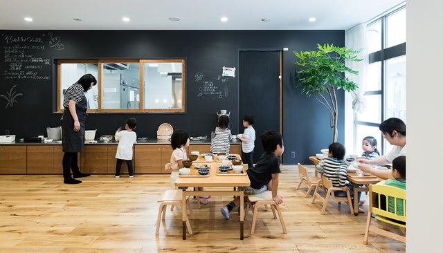 給食で食べる味噌汁のお味噌は毎月園児が仕込むなど、食べることを真ん中に、生きる力を育む保育園です。鹿児島県の繁華街、天文館商店街に立地し、食への向き合い方や街との関りが評価され、2018年キッズデザイン賞、2020年グッドデザイン賞、第3回ジャパンSDGsアワード特別賞(2019年)を受賞しています。
