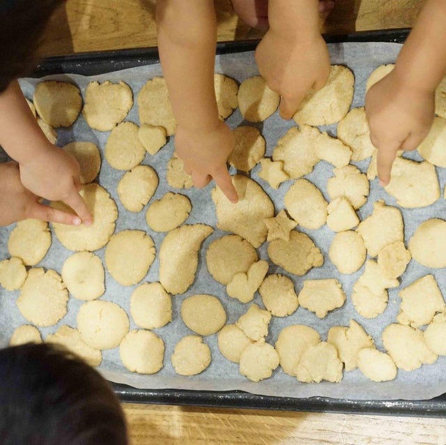 その中でも簡単に作れるクッキーは子ども達にも人気の活動で、0歳〜2歳クラスの子どもたちは先生と一緒に、3・4・5歳の異年齢混合クラスでは子どもたちだけで焼き上げます。