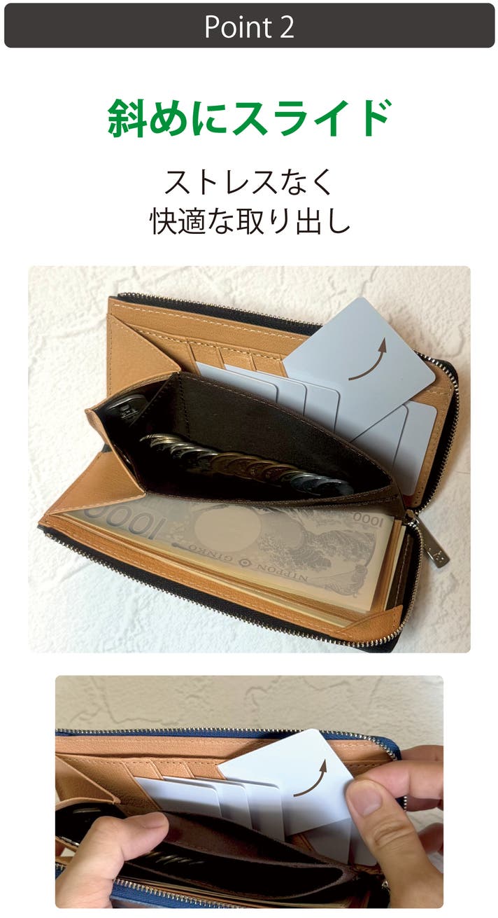 <画像・上> 手前のマチを無くす事で、カードを引き抜きやすく、紙幣の出し入れもスムーズ。