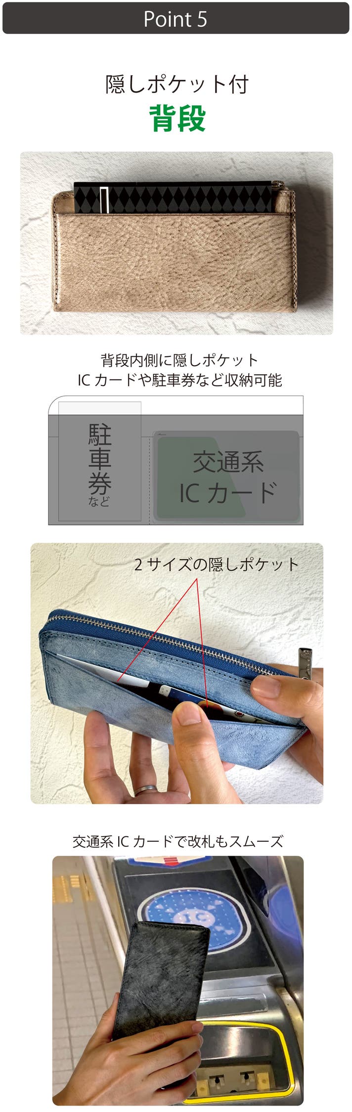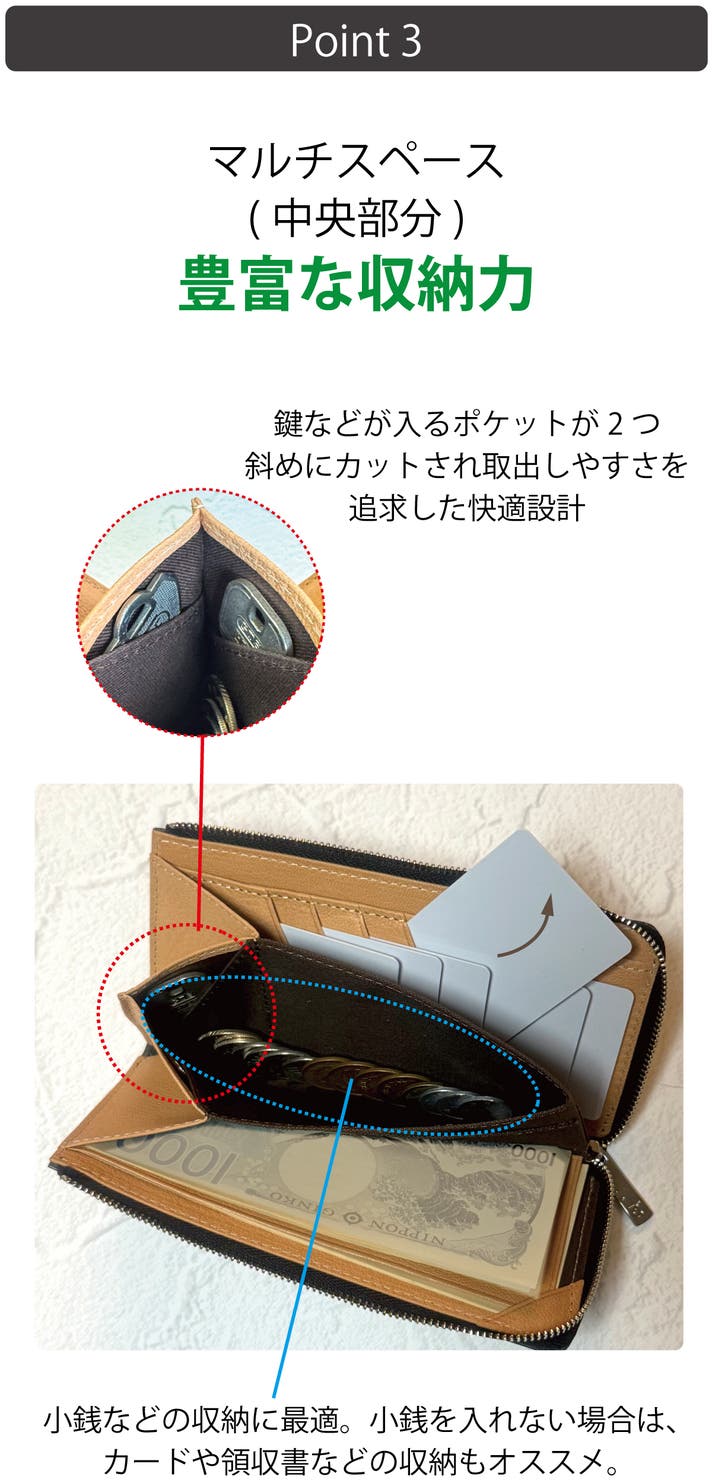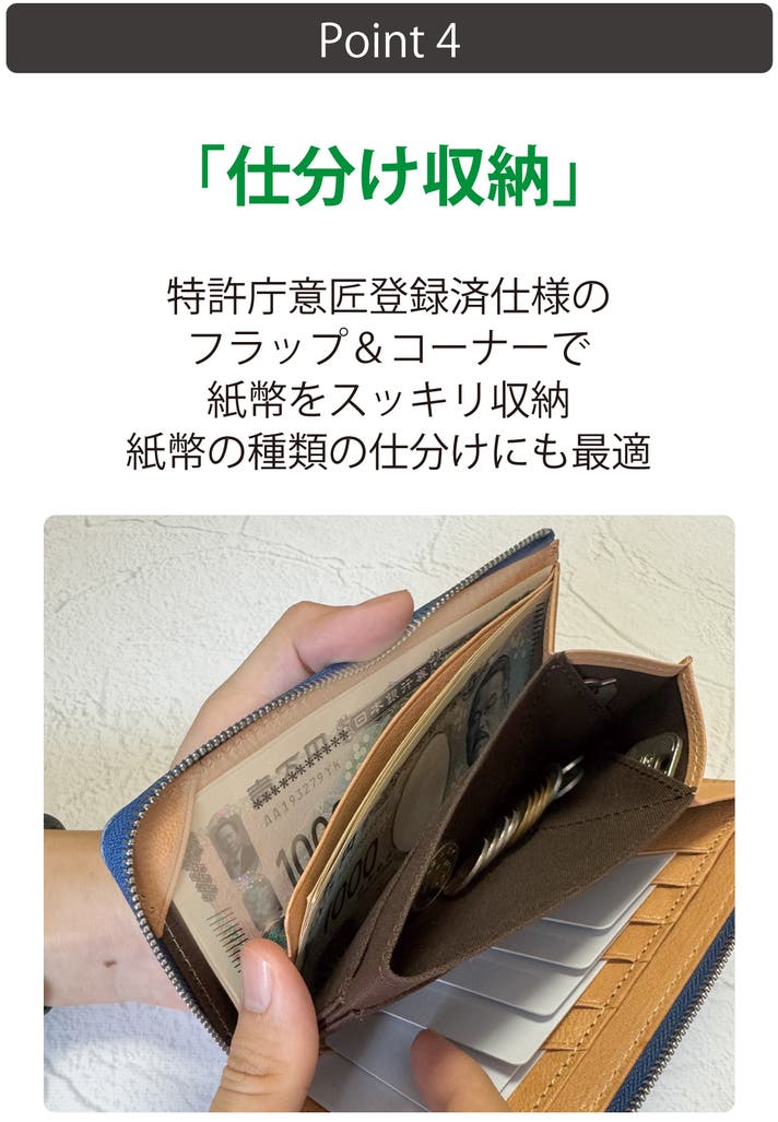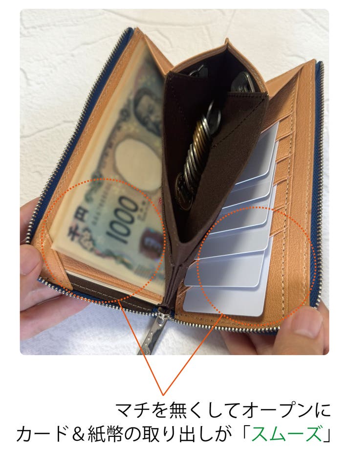 「フラップ&コーナー」で紙幣がファスナーに挟まるというストレスを軽減。