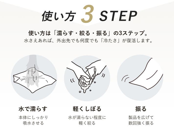 水に濡らして軽く振るだけで、体感温度-15.6℃のひんやり感を実現。