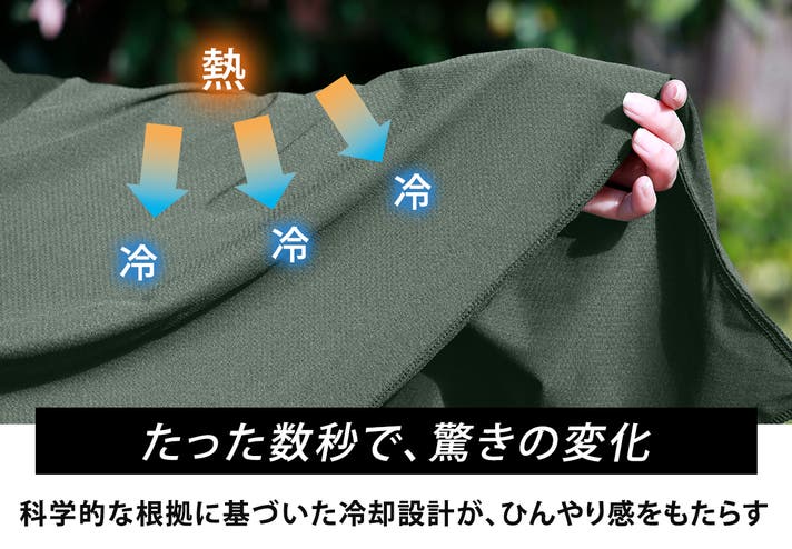 触れるとひんやり感じる冷感素材に、体の熱を吸収・コントロールする科学的な根拠に基づいた特殊素材を組み合わせることで、涼しさの持続を実現。