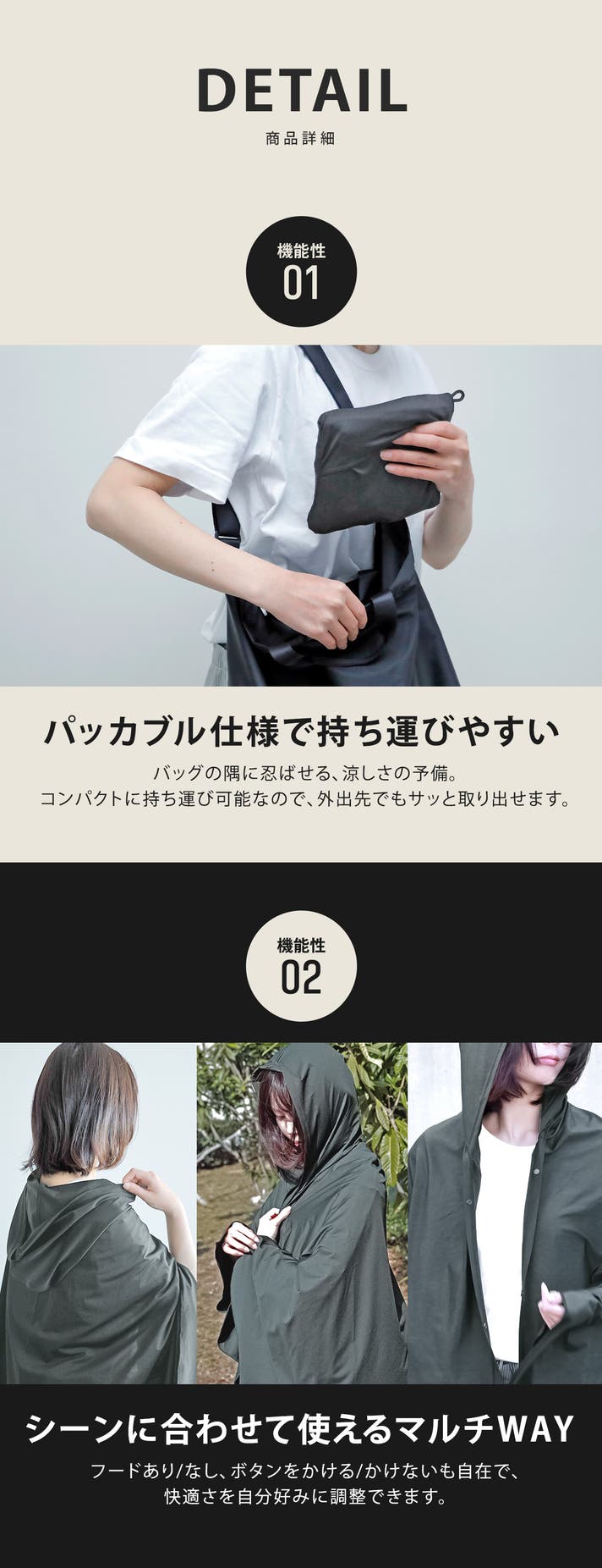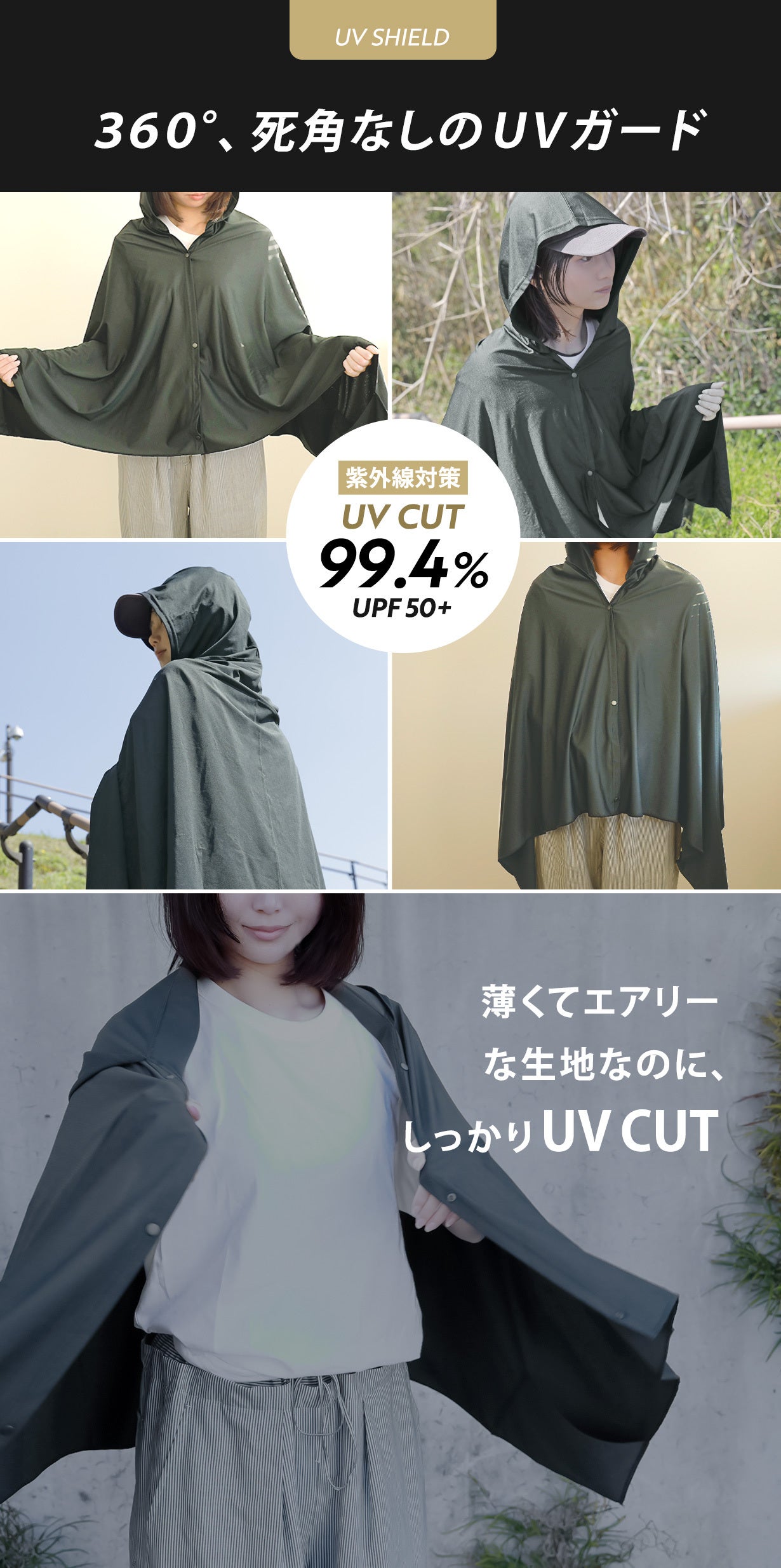 UVカット率99.4%。強烈な日差しを遮り、心地よい風だけを通す“着る日傘”設計。