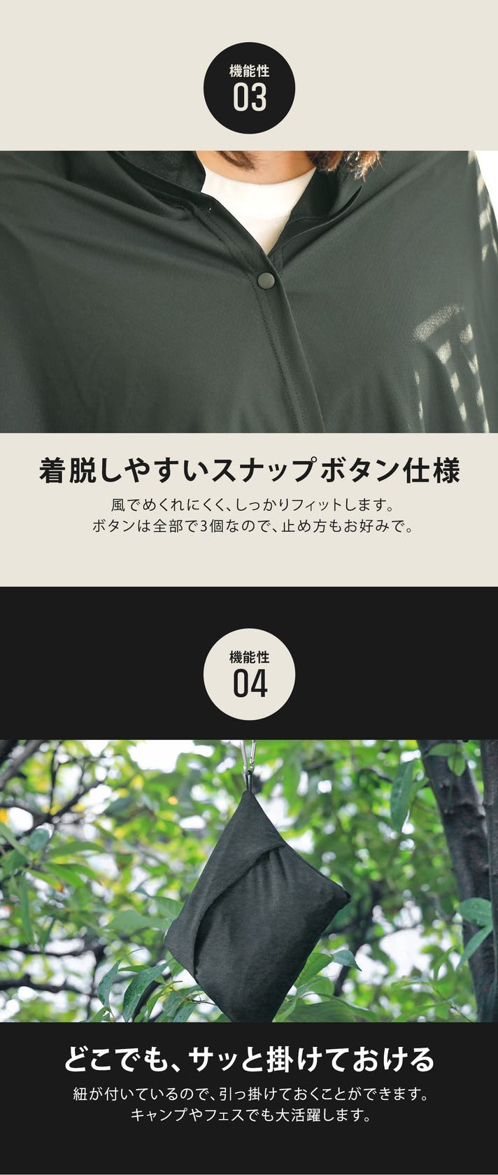 ポンチョならではのカバー力で、首の後ろや二の腕までしっかりガード。