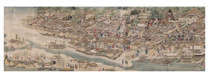 2.国の重要文化財に指定された秋田蘭画の画像や江戸の町割り地図、商用利用としては初めて許可された秋田街道絵巻(上中下巻合わせて全長30数メートルに及ぶ)から、「中浜」「御材木場」「御町番所」などを盛り込む。