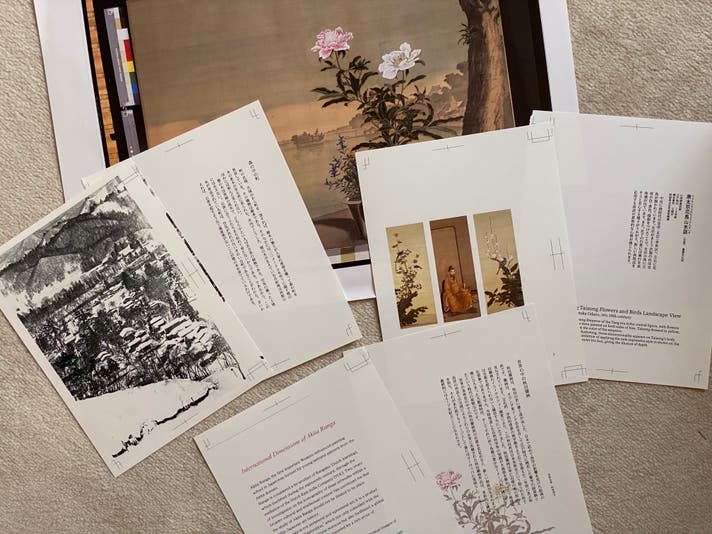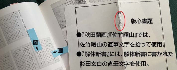 『秋田蘭画』・・・版心書題の「秋田蘭画」の文字は佐竹曙山の直筆文字の写しを使用。(※小田野直武の直筆文字が残っていないため。)また、裏表紙に小田野家に代々伝わる家紋の印を使用。