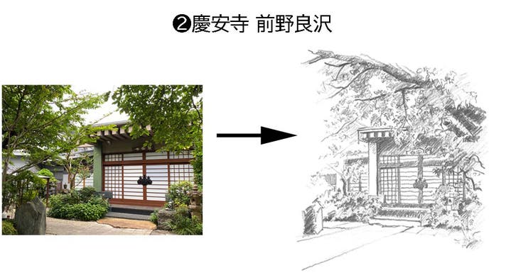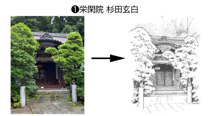 御朱印帳の中に掲載したい寺院についてもご連絡して足を運び、趣旨を説明し、写真撮影の許可を頂き、その写真からデッサン画を描き起しています。