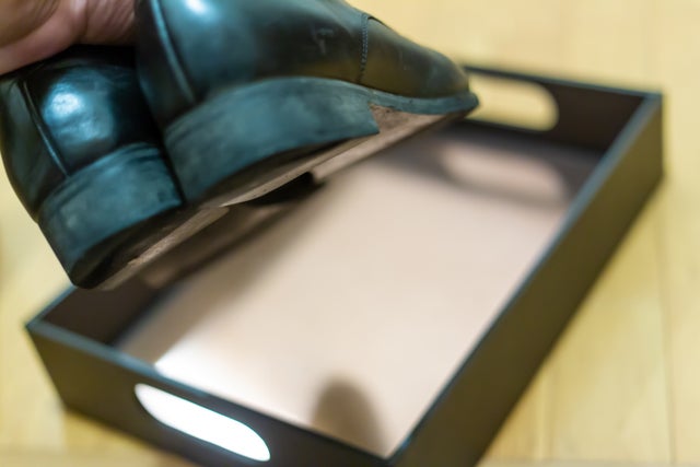 レザー×純銅シューズトレイの使い方はとっても簡単で、いつもの靴を置く場所をシューズトレイに変更するだけでOK。