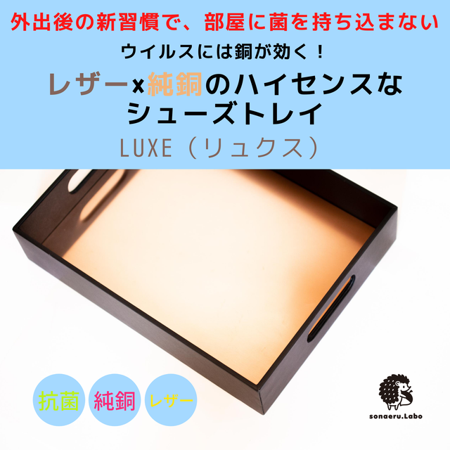 そこで、研究結果から抗菌効果が認められている「銅」に注目し、玄関に置いても違和感のないシンプルな【銅の抗菌力】「レザー×純銅シューズトレイ Luxe」を製作いたしました。