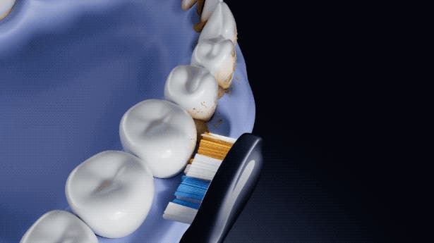 先端のブラシは、通常ケアがしづらい箇所にもしっかりアプローチし、デュアルリング構造のブラシで表面の着色汚れを除去します。ブラシの先端が丸く加工されていることで、歯や歯ぐきへのダメージを軽減するので、口内にやさしく安心してご利用いただけます。