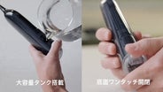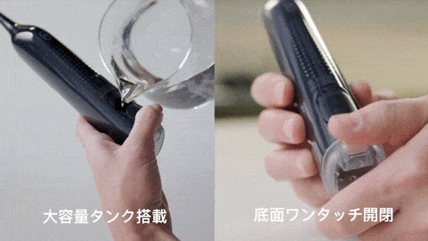 コンパクトな本体下部に大容量タンクを内蔵。1回の給水で口腔内全体の洗浄が可能です。従来のウォーターフロスとは異なり、外部タンクやホースが不要なミニマルデザインで洗面台周りもすっきり。