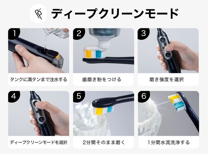 <弱>・<標準>・<強>の3つの磨き強度に加え、<ディープクリーン>と<クイック>の2つのモードを搭載。歯周ポケットの徹底ケアから、忙しい朝の時短ケアまで1本で完結。ワンタッチ操作で、あなたにぴったりの磨き心地が簡単に実現します。