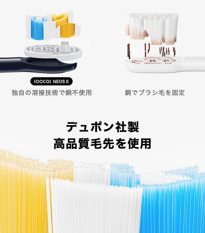 一般的な歯ブラシにはブラシ固定のために銅が使用されるものもあり、湿気でカビや錆の原因になることも。Soocas NEOS IIは銅不使用の植毛技術なので、そうしたリスクを解消し安全安心のオーラルケアを実現します。