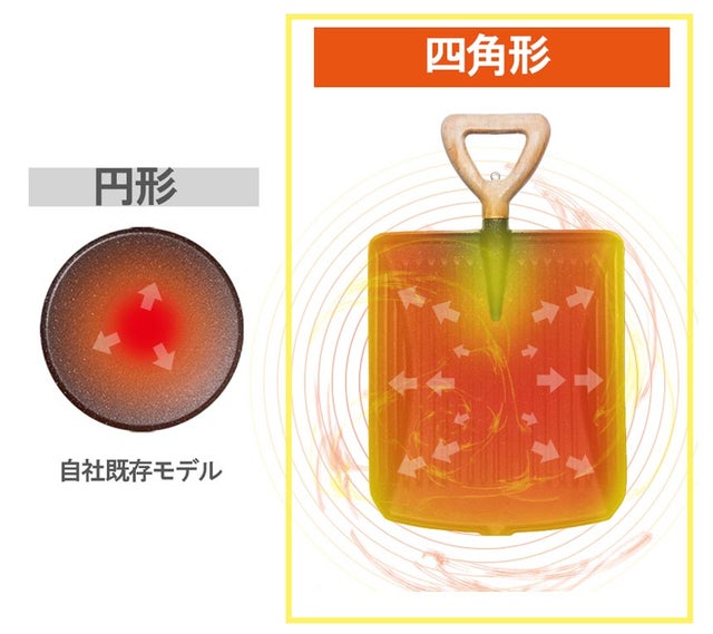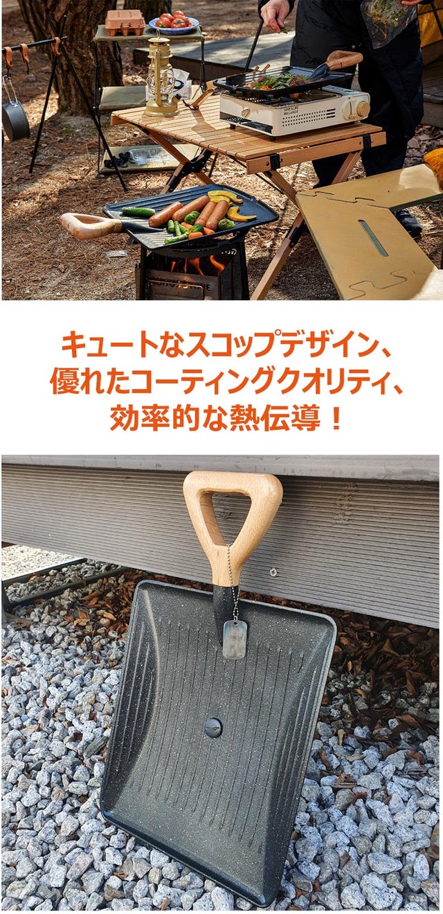 - シャベルグリドルは四角形のデザインで、円形よりも一度に多くの具材を調理することができます。