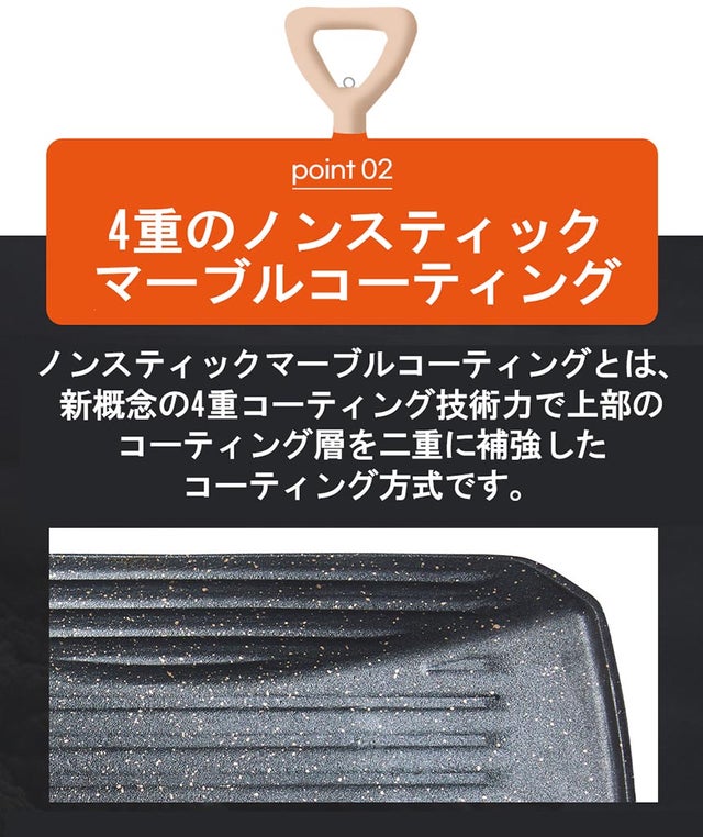 - 食べ物がくっ付きにくいノンスティックマーブルコーティングで食品衛生法に基づいたテストに合格 !