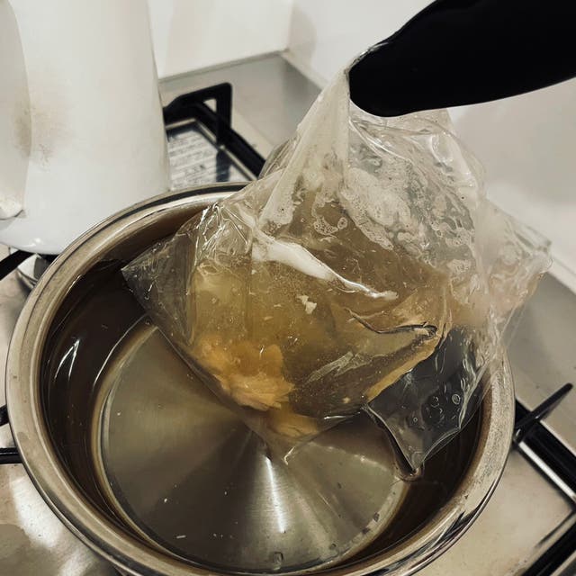 これに熱湯で5分湯煎してかけます。熱いのでやけどに注意。
