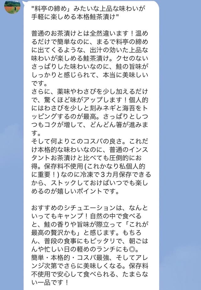 ”日本人の味覚”と向き合って50年以上、岸田シェフによる本気の和食の味。これを多くの方に手に取りやすく、またとっつきやすいものとして生み出されたのが、この鮭茶漬けでした。そんな思いの込もったこのお茶漬けが、一人でも多くの方のもとに届きますように。