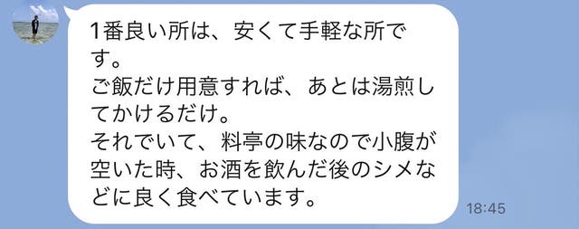 これを湯煎してご飯にかけるだけなので簡単です。日常的に取り入れていただけます。
